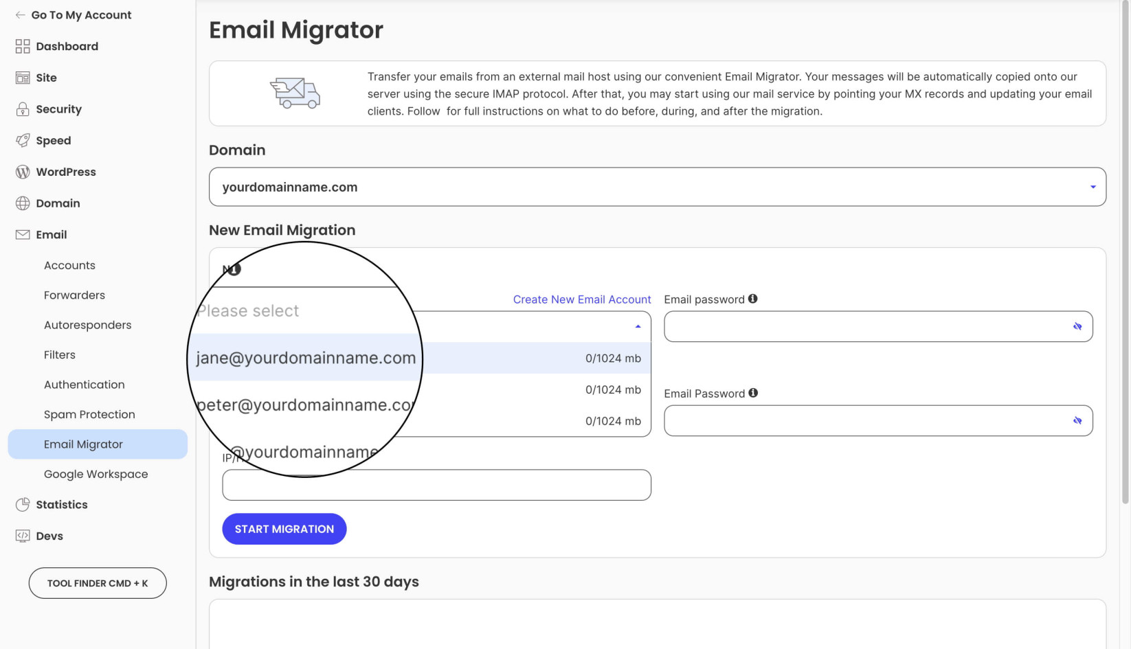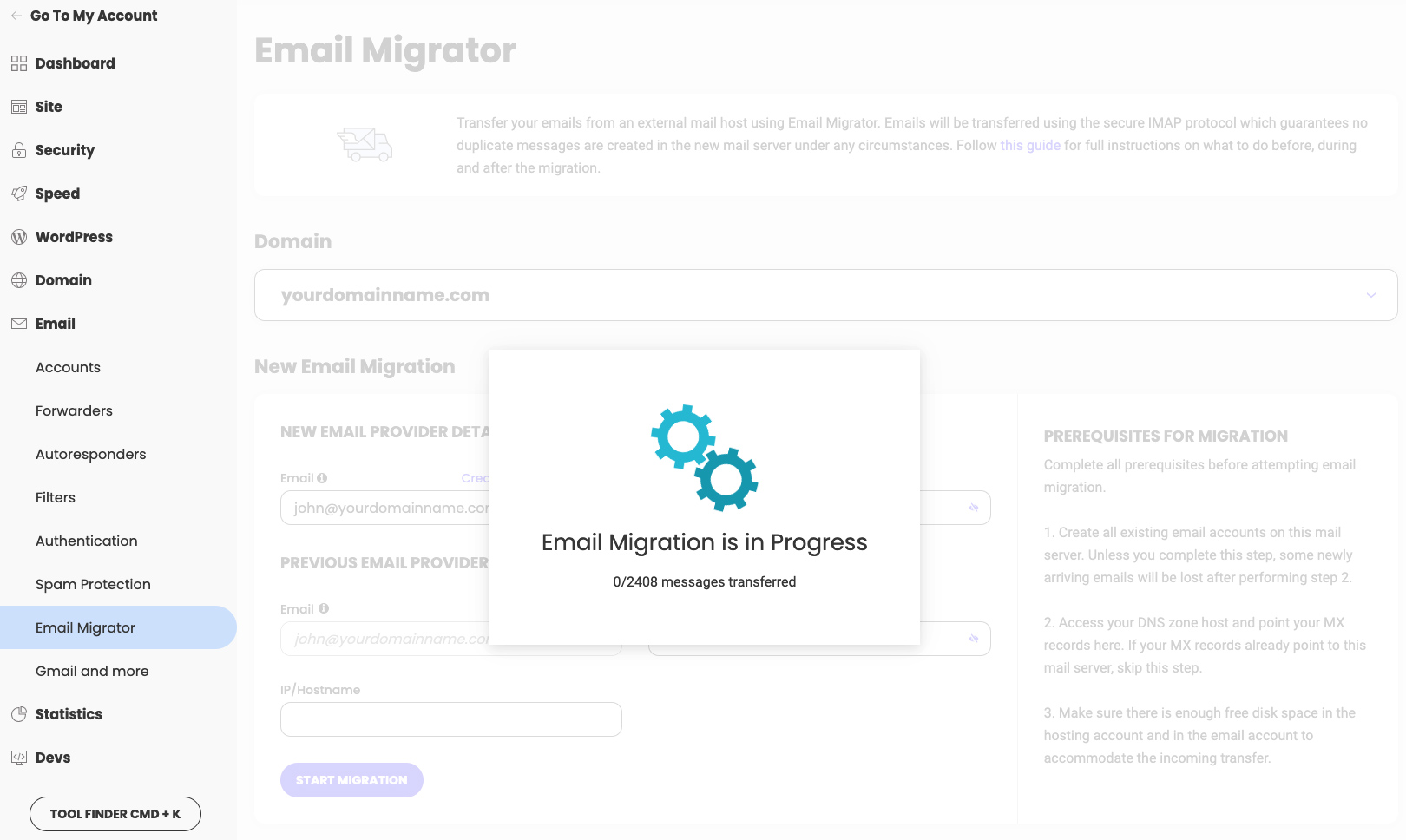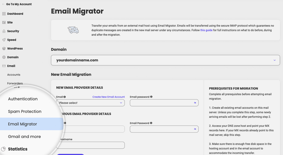 To start an email migration go to Site Tools > Email > Email Migrator. The tool will allow you to transfer email messages from your previous server to your current one.