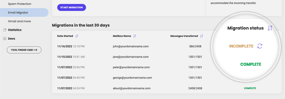 If only part of the email messages have been transferred, you will see an Incomplete status in the record of the migration and you should retry the transfer. The retry of an incomplete transfer will move over only the remaining untransferred messages.