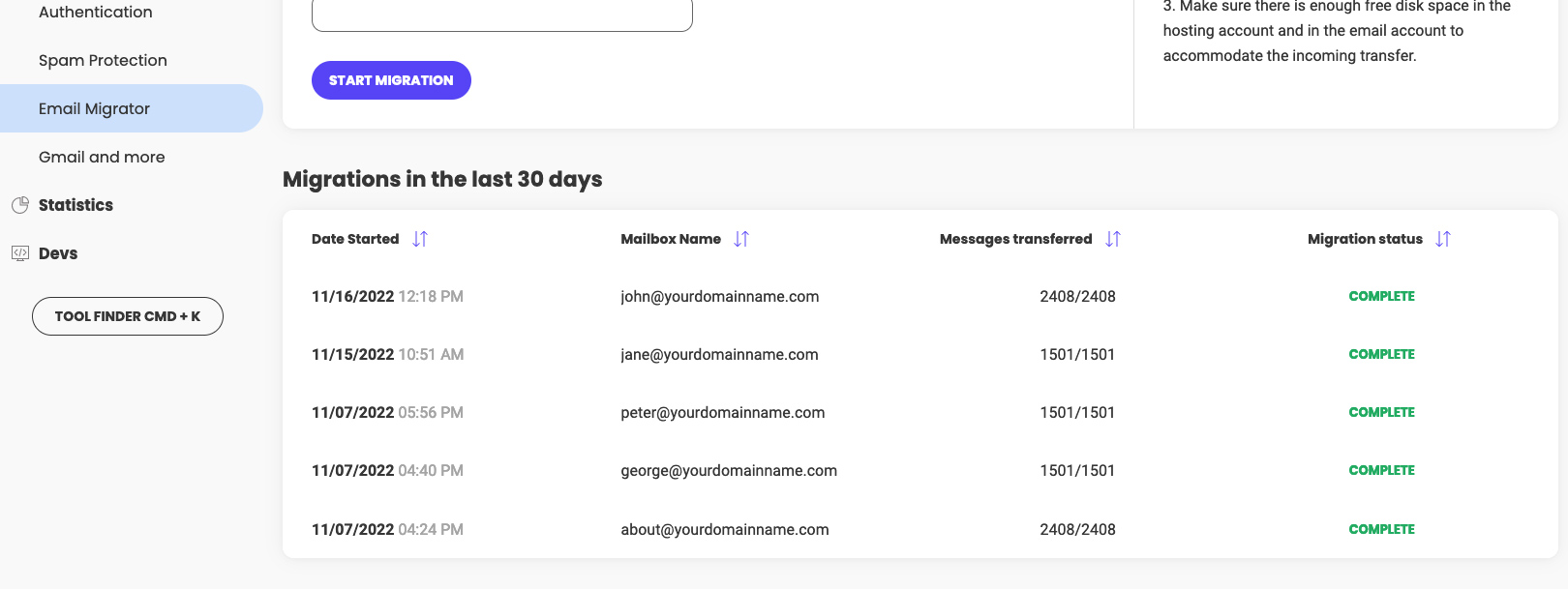 Once the process has ended you can verify if all of your messages have been successfully transferred in the Migrations within the last 30 days table.