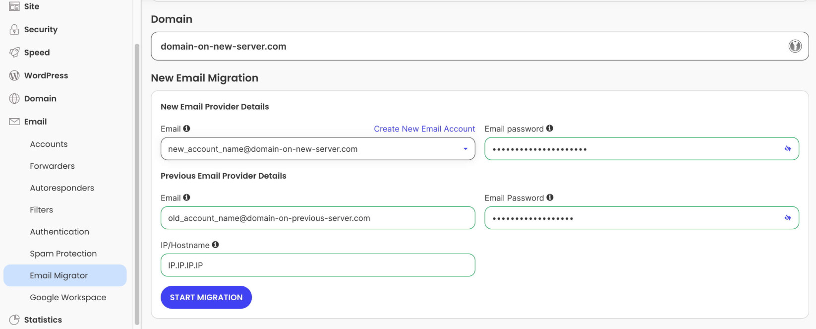 Before you start the migration process, you need to create an email account on our server, where the messages will be transferred. If you have already created the email account from Site Tools > Email > Accounts, then select it from the Email drop-down in section New Email Provider Details.