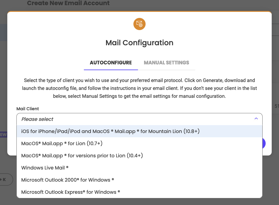 You can also find the exact settings to use with each of your mail accounts with your Outlook in your Site Tools > Email > Accounts, choose the preferred email account and go to kebab menu > Mail Configuration and select Manual Settings tab.