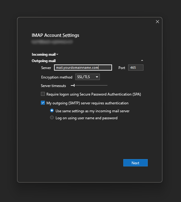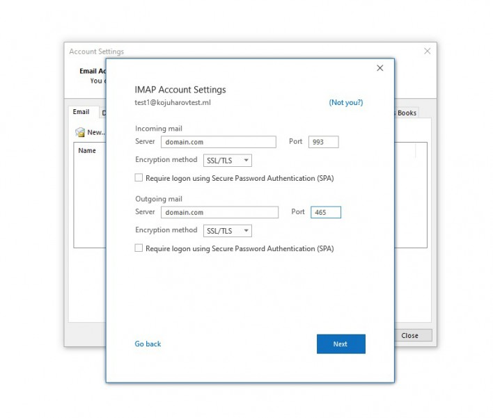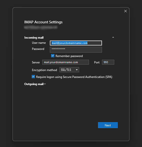A new popup will appear where you should change all the settings to the desired new ones. Note that you should review both the Incoming mail and Outgoing mail sections.