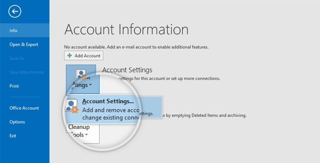 To add your email account to the latest version of Microsoft Outlook first click on the File menu and then on Account Settings > Account Settings. If you’re using the Mac version, the menu will be in Outlook > Preferences > Accounts.