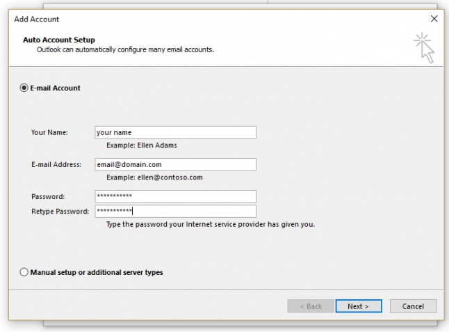 Outlook will automatically connect to the hosting server, find the automatically created settings and set them for you. You need to only click Next to add the account.