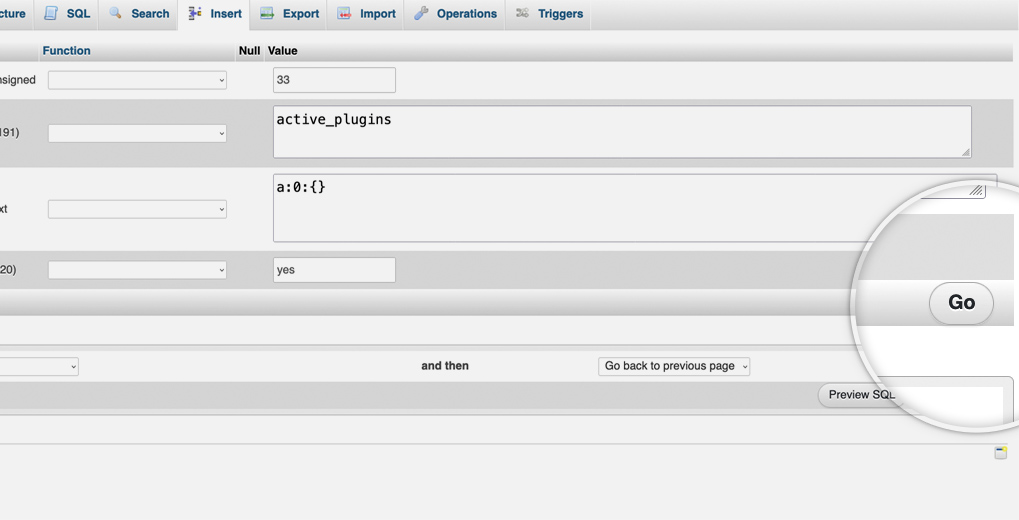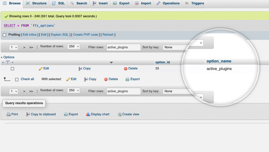 a:2:{i:0;s:19:"akismet/akismet.php";i:1;s:9:"hello.php";}To disable all plugins, replace the code with the following: